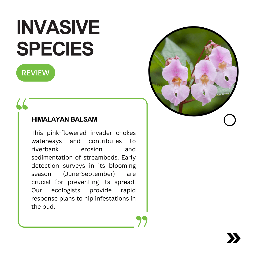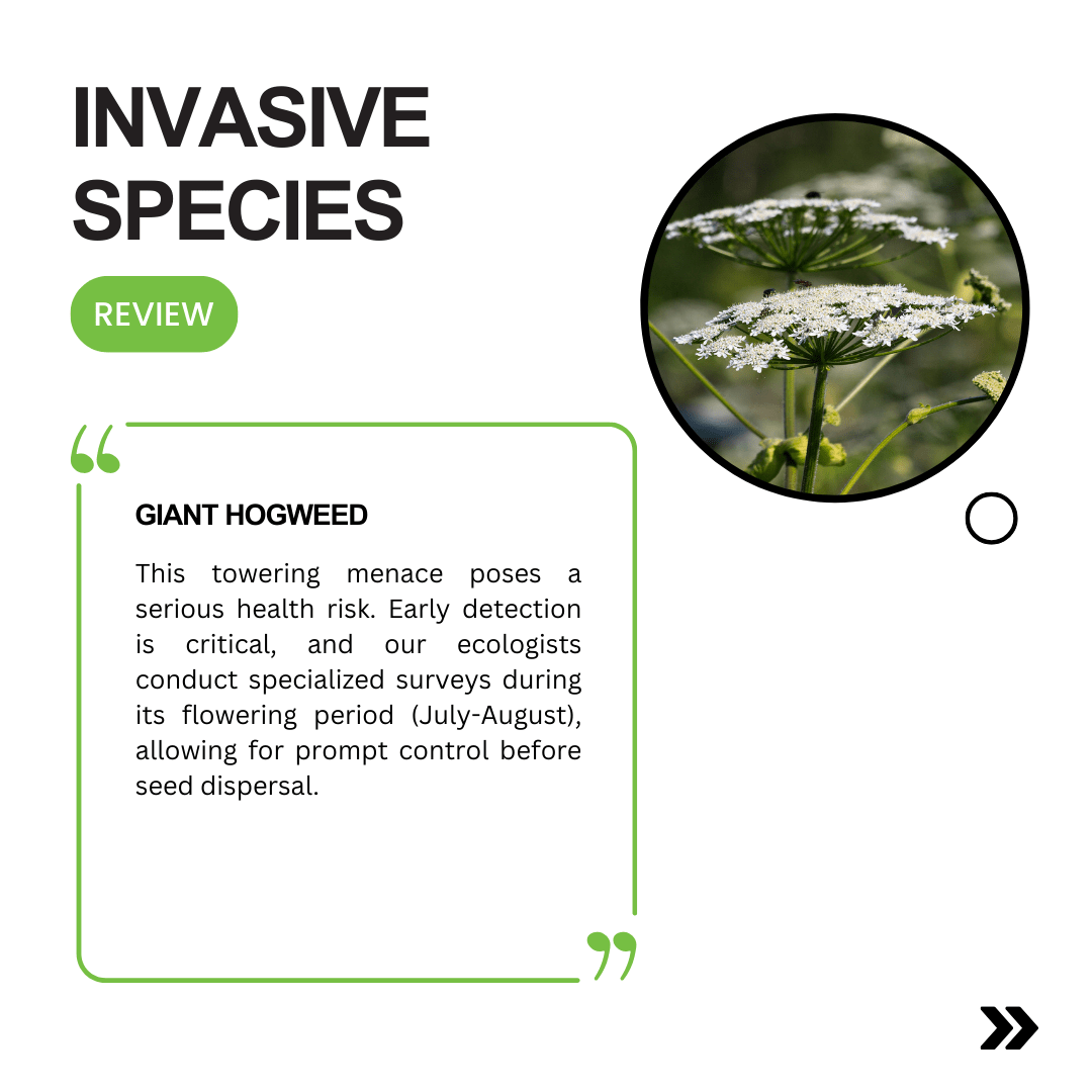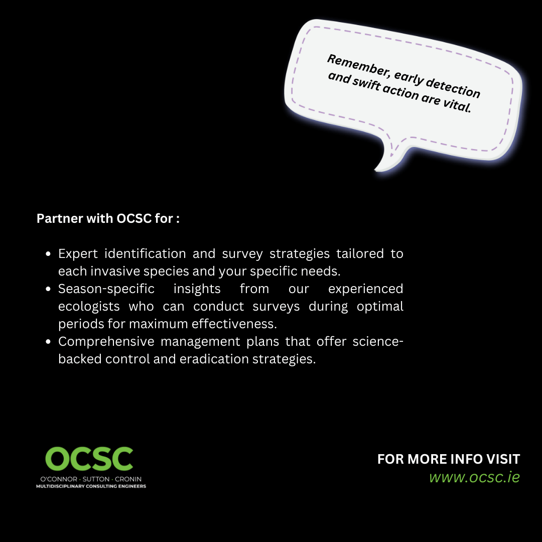 Ireland’s stunning landscapes harbour not just breathtaking beauty, but also delicate ecosystems vulnerable to invasive species. At OCSC, our expert ecologists not only conduct surveys to identify these unwelcome guests but also offer crucial insights into how to best manage them. Here’s a closer look at some common invaders and how our team can help: