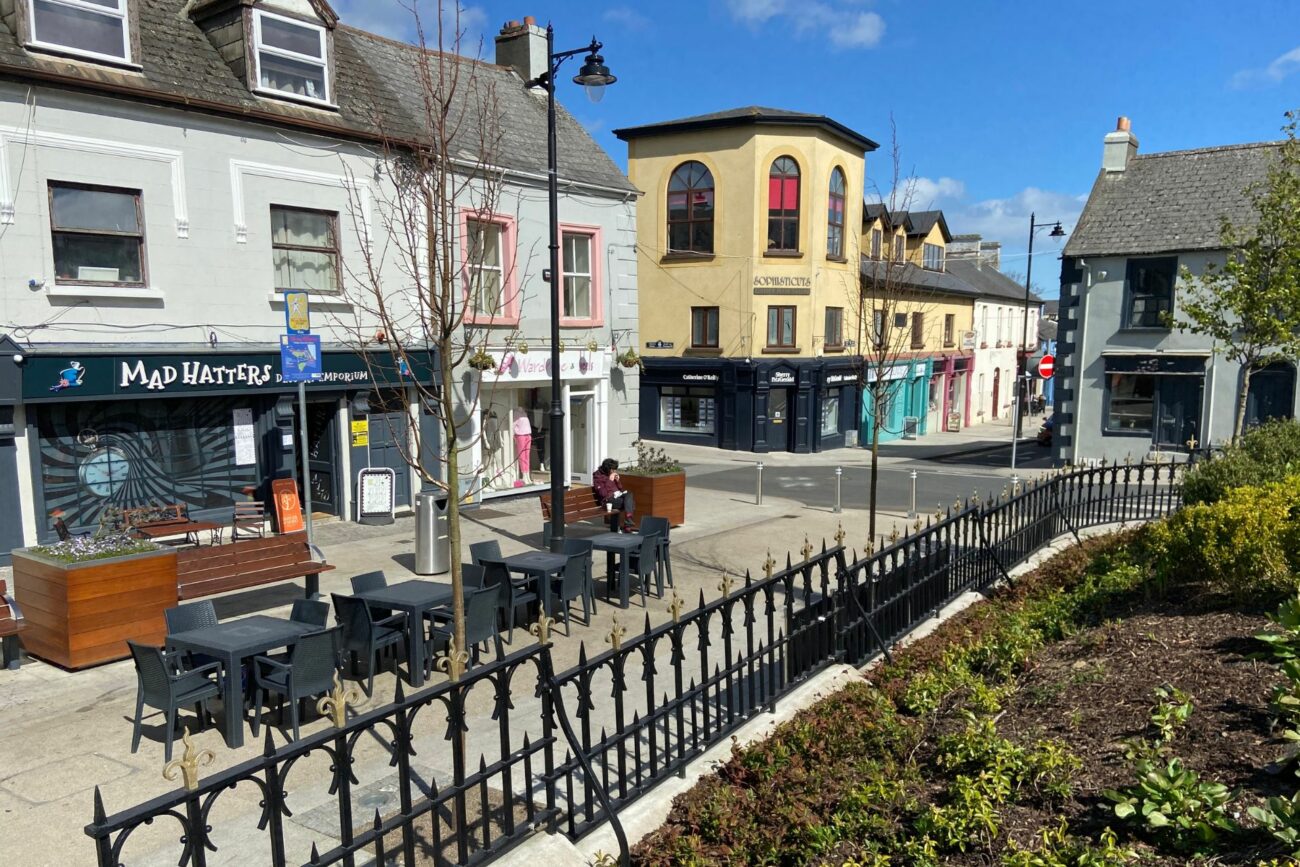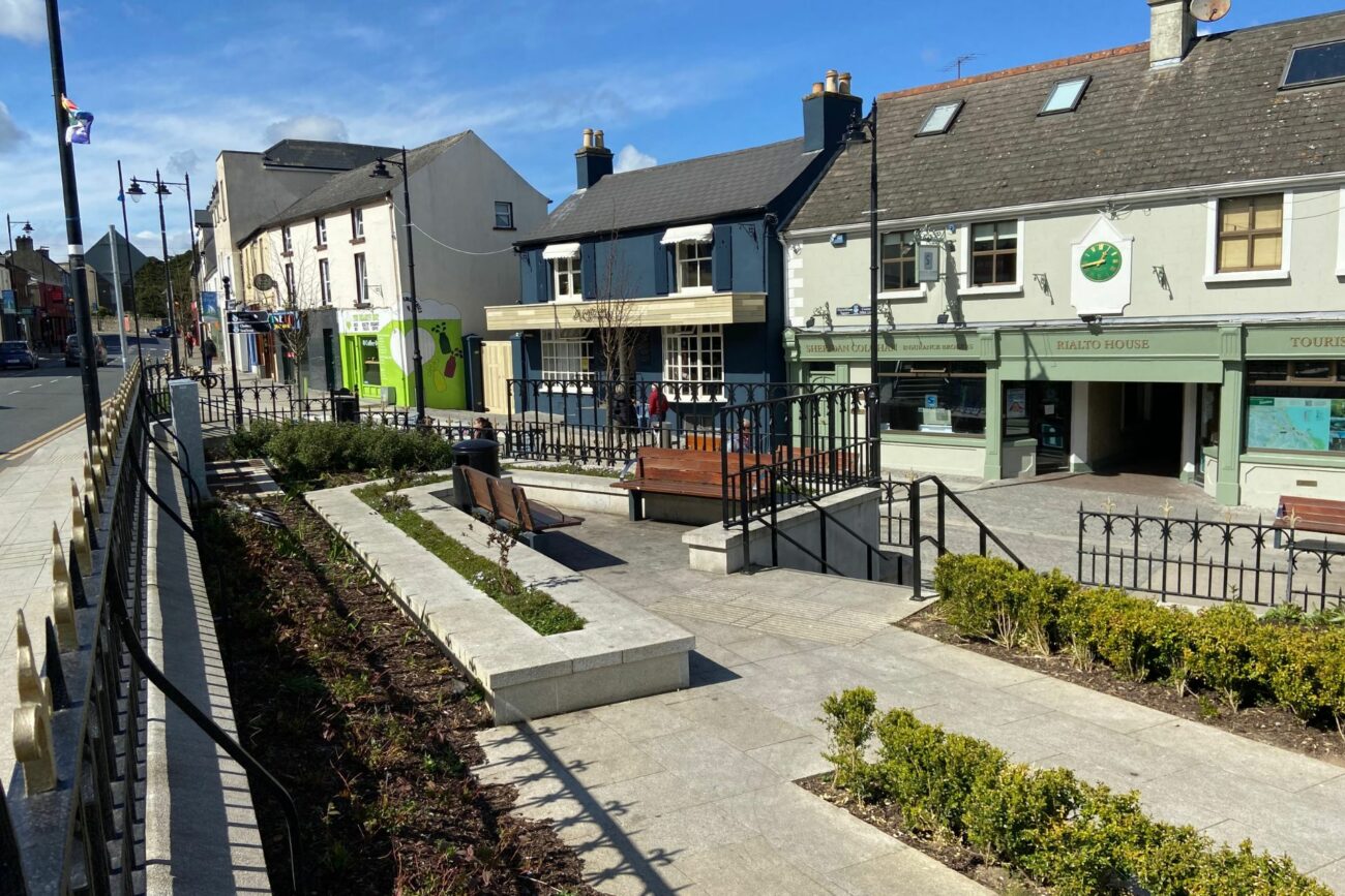 - The historic street pattern was retained on the southern side of the central space through smaller unit pavings. Footpaths resurfaced throughout and a new public realm was created on the northern side of the central space. The footpath on the northern side of Bridge Street was widened, loading bays incorporated into the new paving and high-quality paving flags and setts utilized to be consistent with the treatment and materials used at Market Square in the town. The palette of street furniture includes cycle stands, bins, bollards, and directional signage to enhance the legibility of the town center.