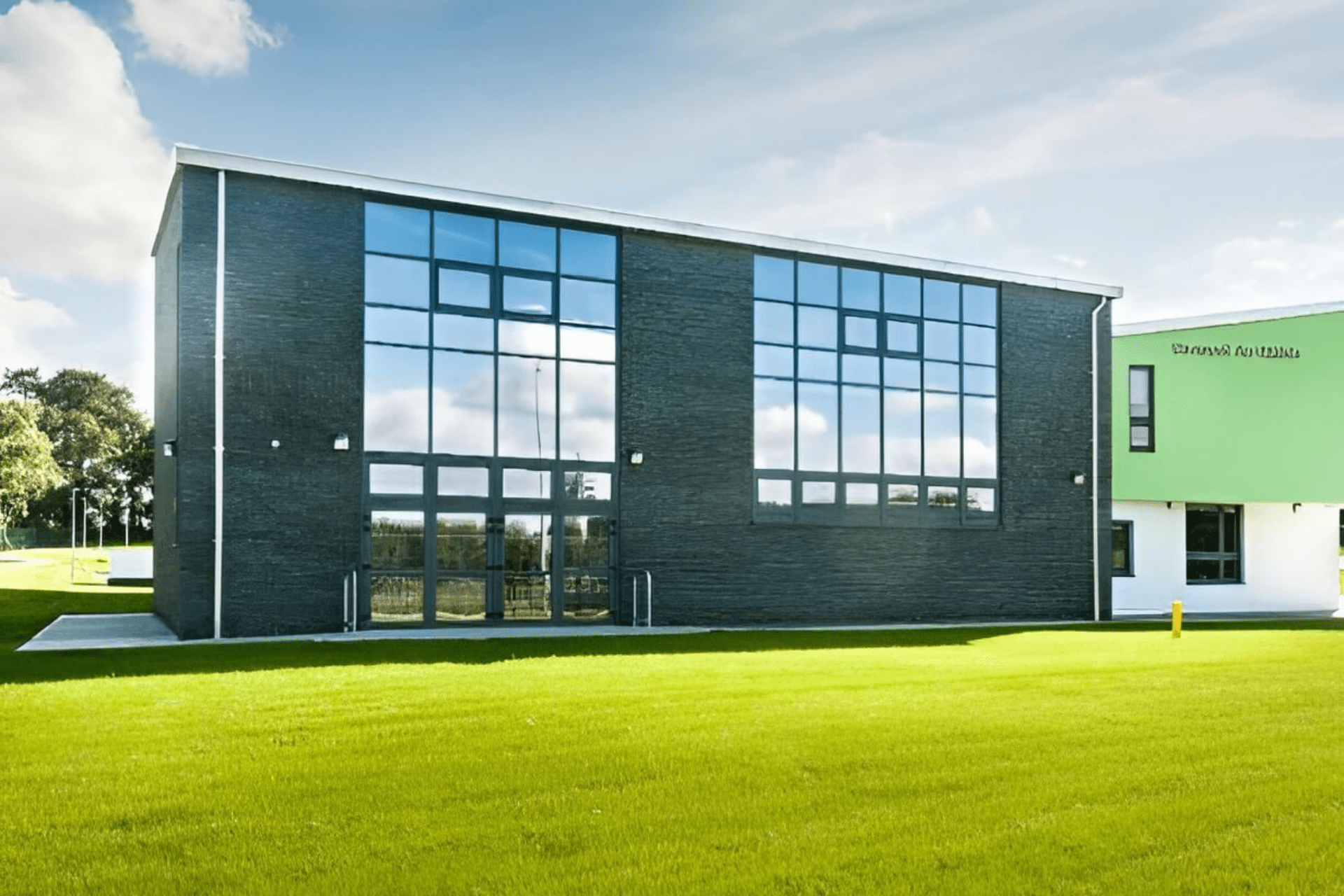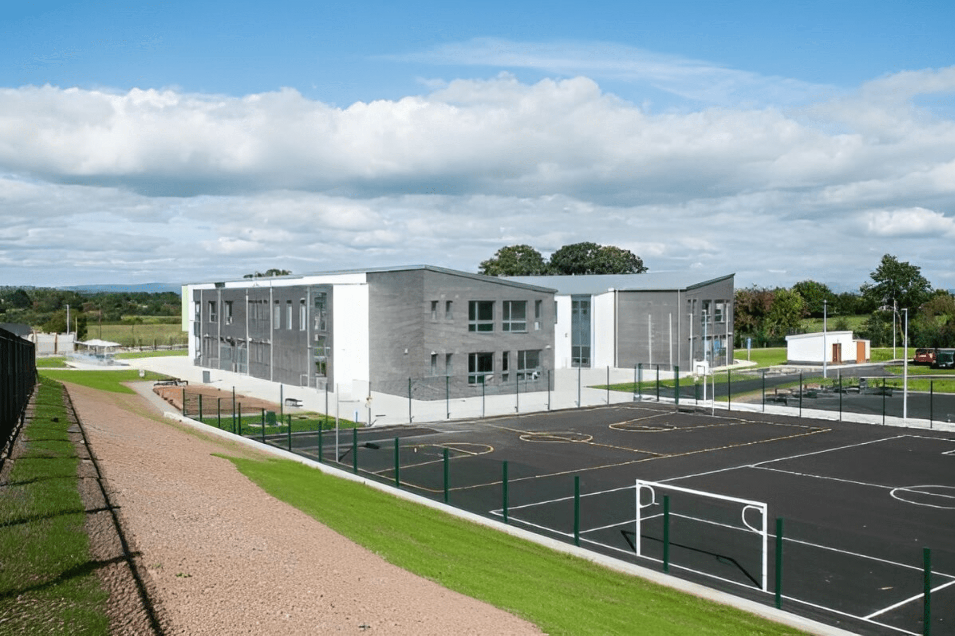 • Site works included a new access road, new vehicular and pedestrian entrance, cycle storage, bin store, external storage buildings, ball courts, landscaping, boundary treatment, drop-off, and pick-up facilities.