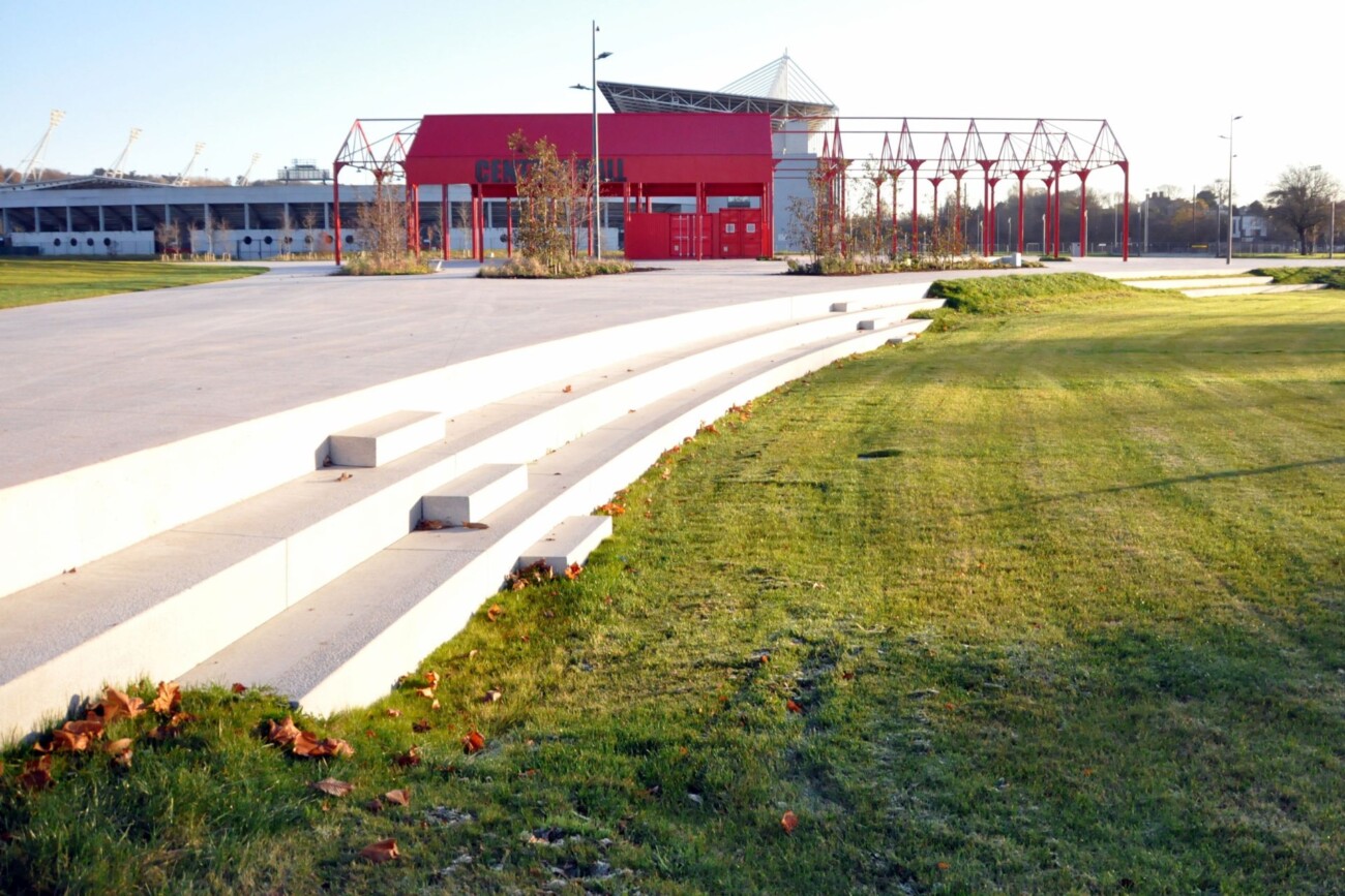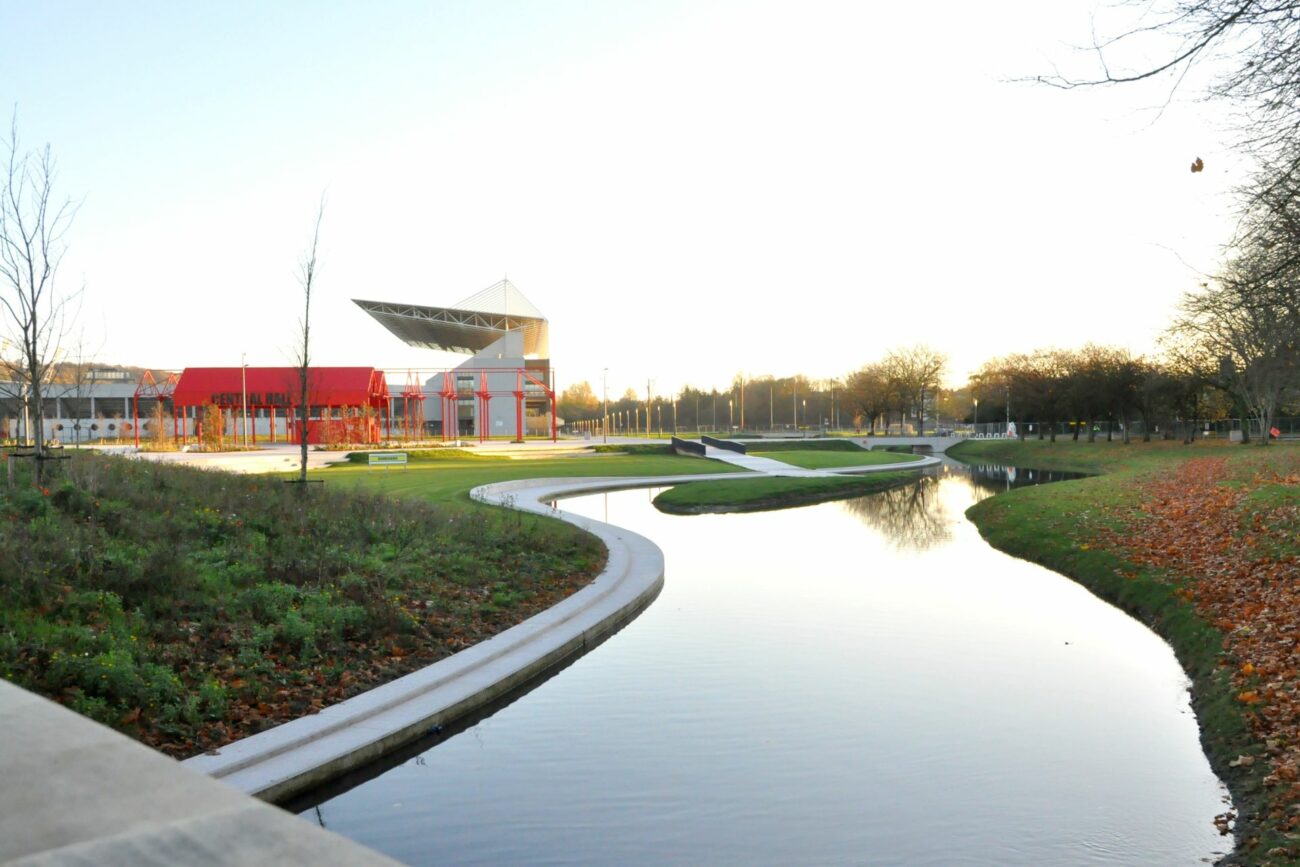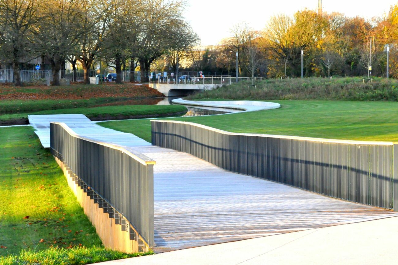 - The project contains some unique features representing the ingenuity of the design and the skill in construction. Most notable is the use of polished concrete as a surface finish to some 6,200sq.m pedestrianized public realm in addition to the riverfront walkways, provision of Bridge and Culvert Structures including a Timber Boardwalk, and seating areas, The central hall structure is a replica of the showground’s central hall previously occupying the site.