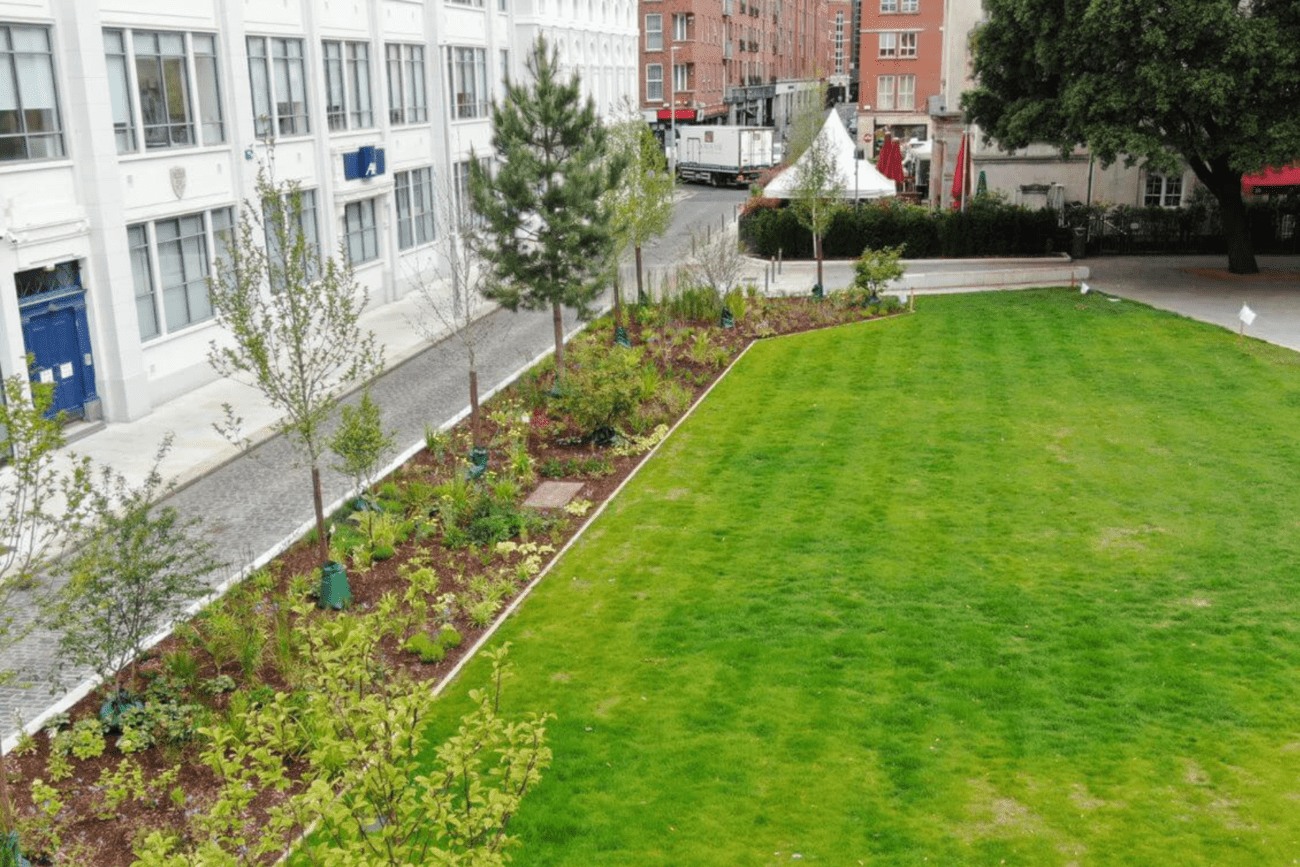 - The landscaped area was populated with a variety of trees, hedging, planting, and a hybrid grass area, and a series of existing benches were upgraded and enhanced through granite cladding and treated timbers to provide an inviting public realm area.